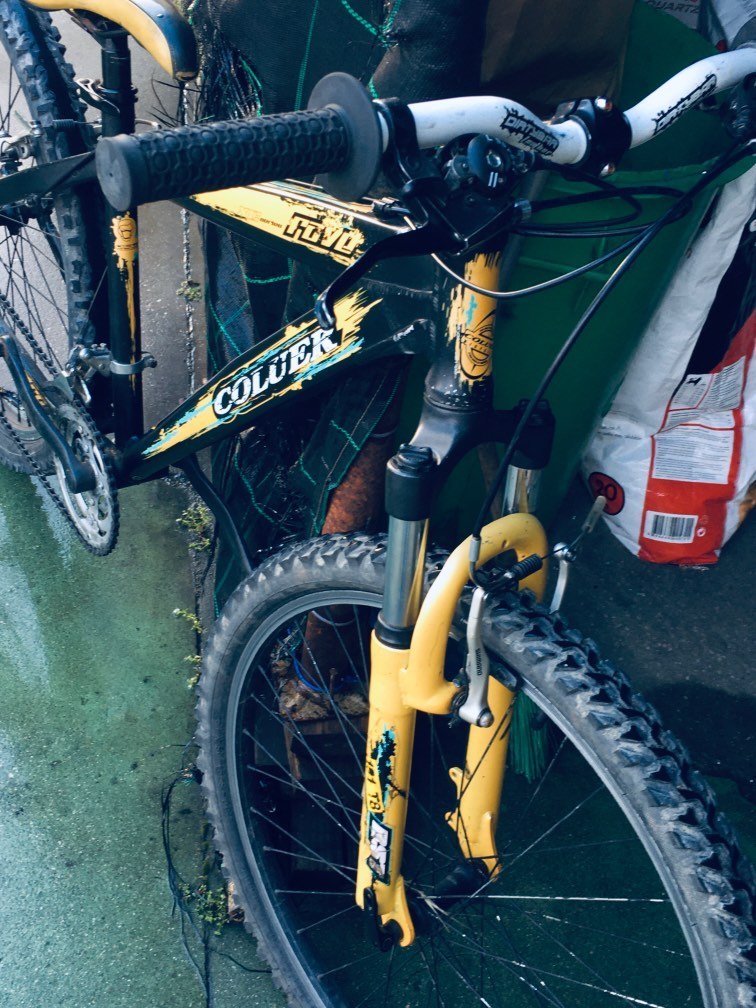 Bicicleta anda perfeitamente, a necessitar de roda traseira. A pintura em algumas partes está um pouco gasta devido ao longo do tempo. O selim possui alguns rasgos devido ao seu uso no dia a dia.