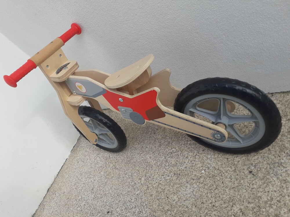 Bicicleta de Equilíbro / Aprendizagem sem pedais. Em Madeira. Estilo moto retro. Semi-nova.
