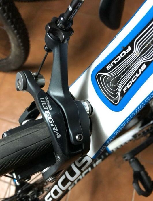 Bicicleta de estrada Focus Cayo Evo equipada com grupo Shimano Ultegra. Apresenta-se em bom estado, com alguns sinais normais de uso.