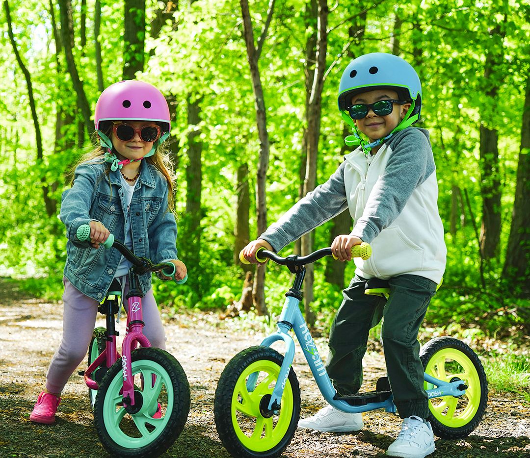 Kazam: "Featuring a sturdy steel frame & fork, puncture proof EVA foam tires and our patented foot rest, your child will have a blast learning how to ride as they push along on this colorful balance bike. No more training wheels!"